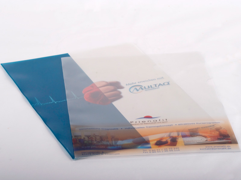 aus PVC-Hart- oder PVC-Weichfolie – transparente Folien außen mit Druck, 2seitig geschlossen, passend für Inhalt A5 oder A4.